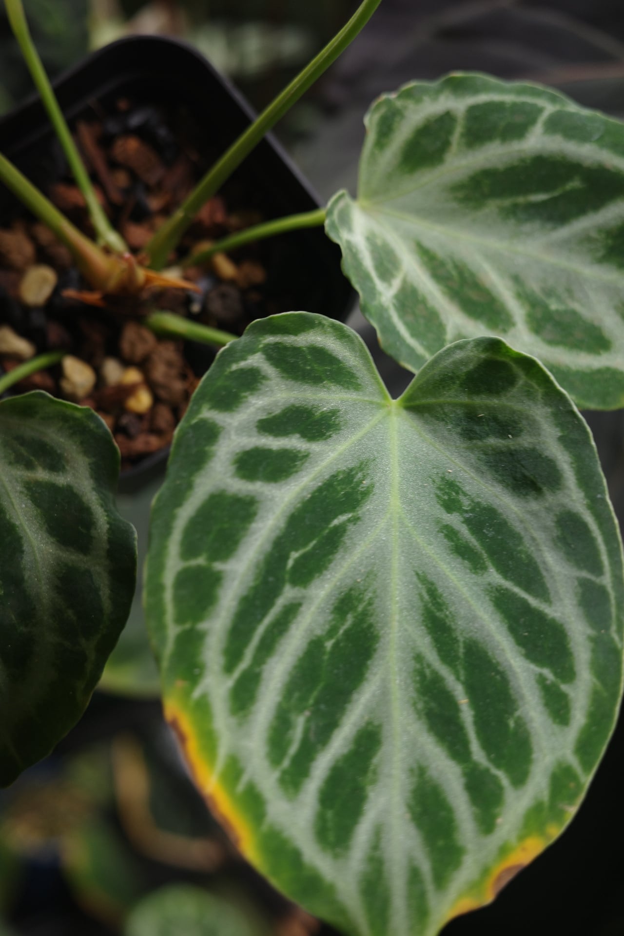 その名の通り、深いグリーンの葉面にシルバーの葉脈が虎の模様のように走り、非常にコントラストの強い表情を見せます。