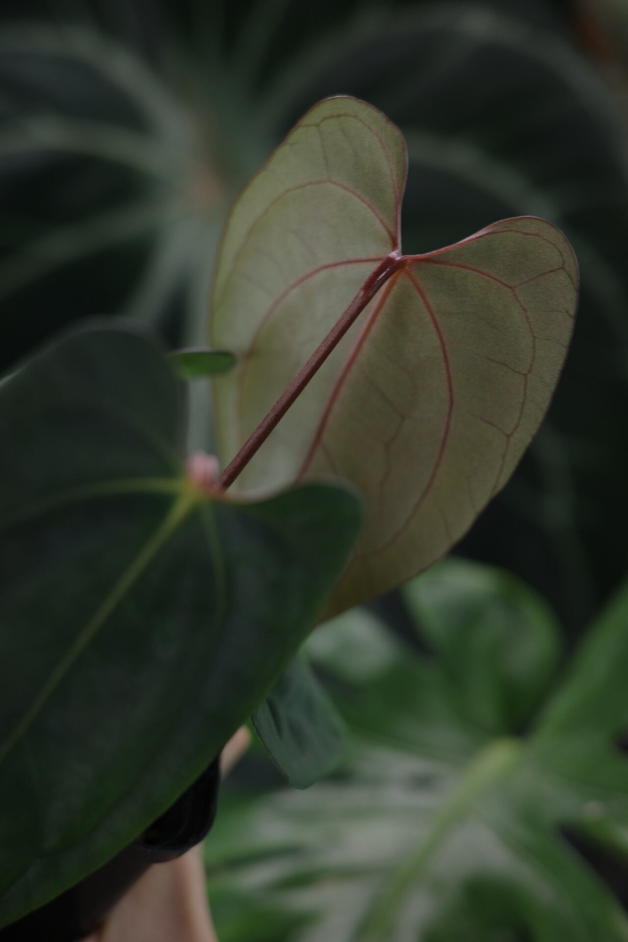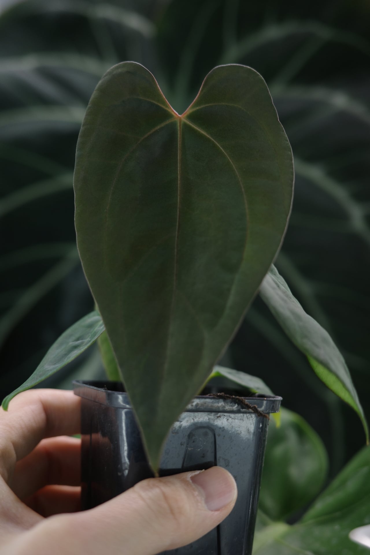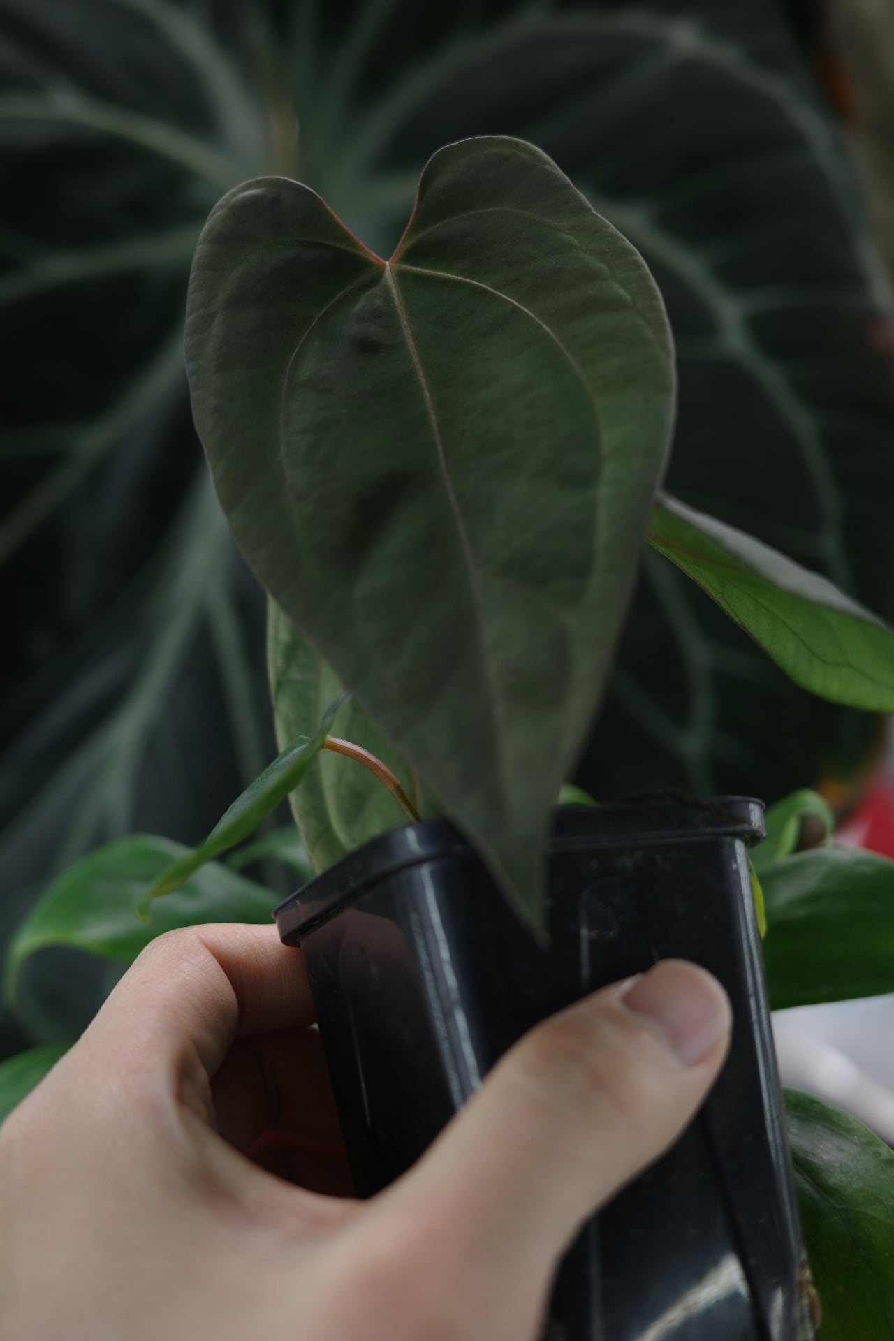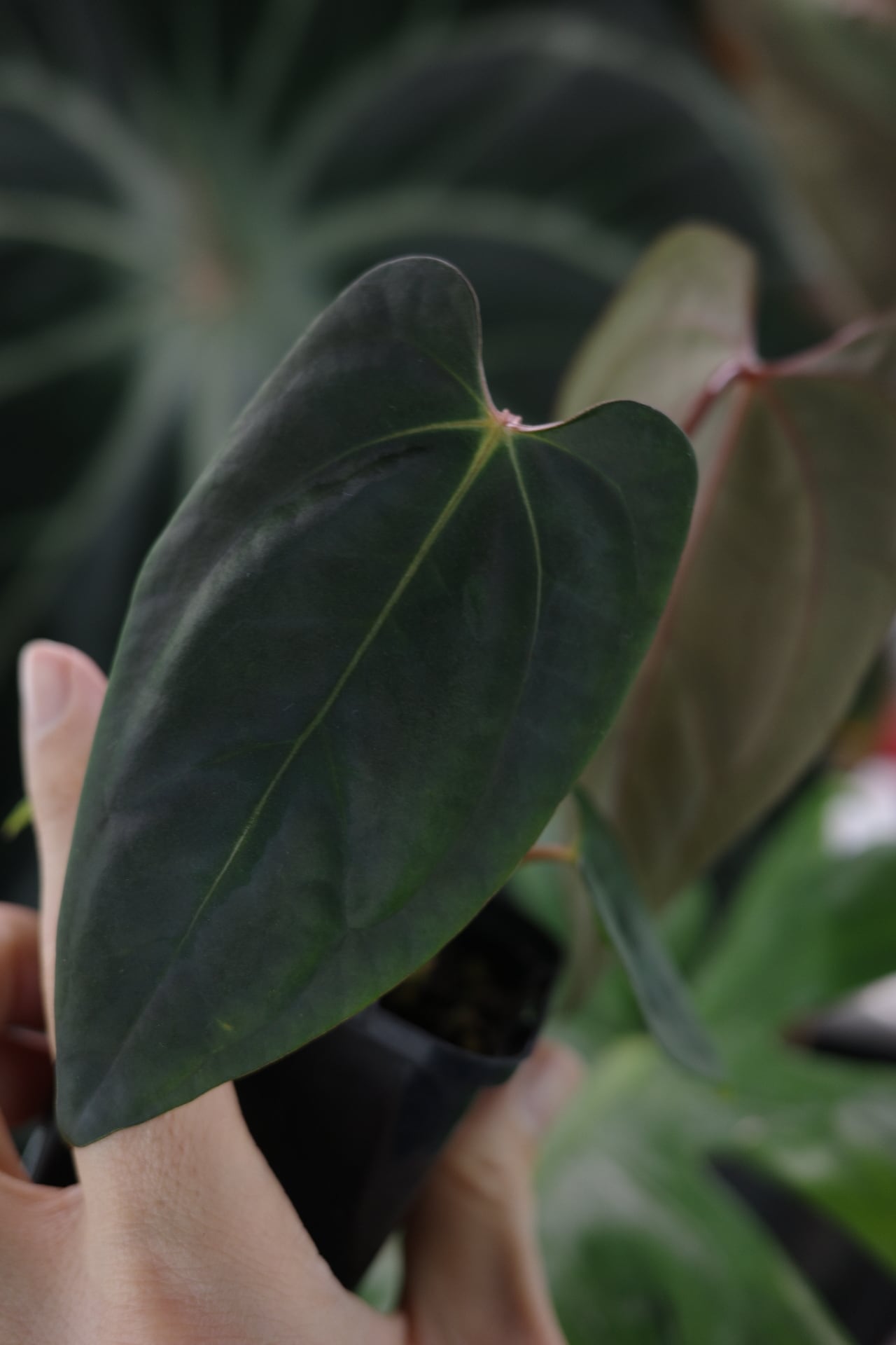 質感的には写真の通り、現時点でも非常にダークで奥行きが感じられます。葉柄に赤みが載っているので、今後こうした色素が葉脈や葉全体にいきわたるでしょう。