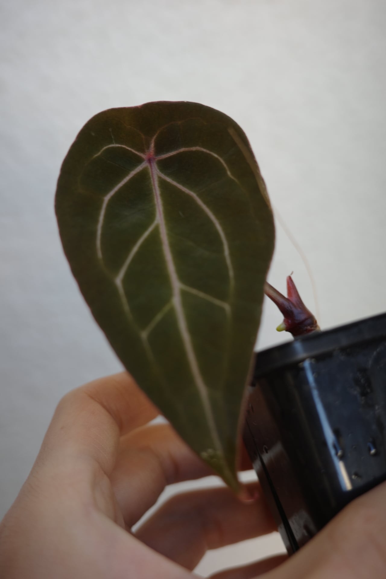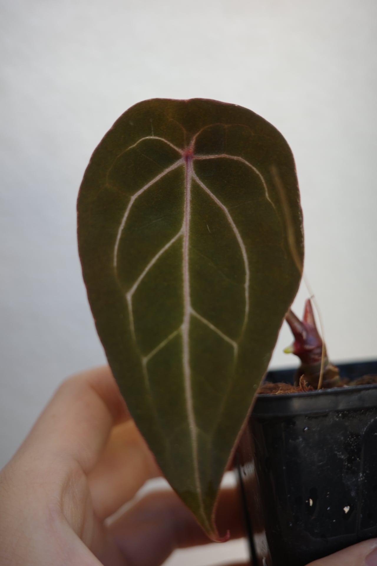 完成度は高く、赤いドットが中心に見えます。また、葉脈もやや赤く、存在感があります。